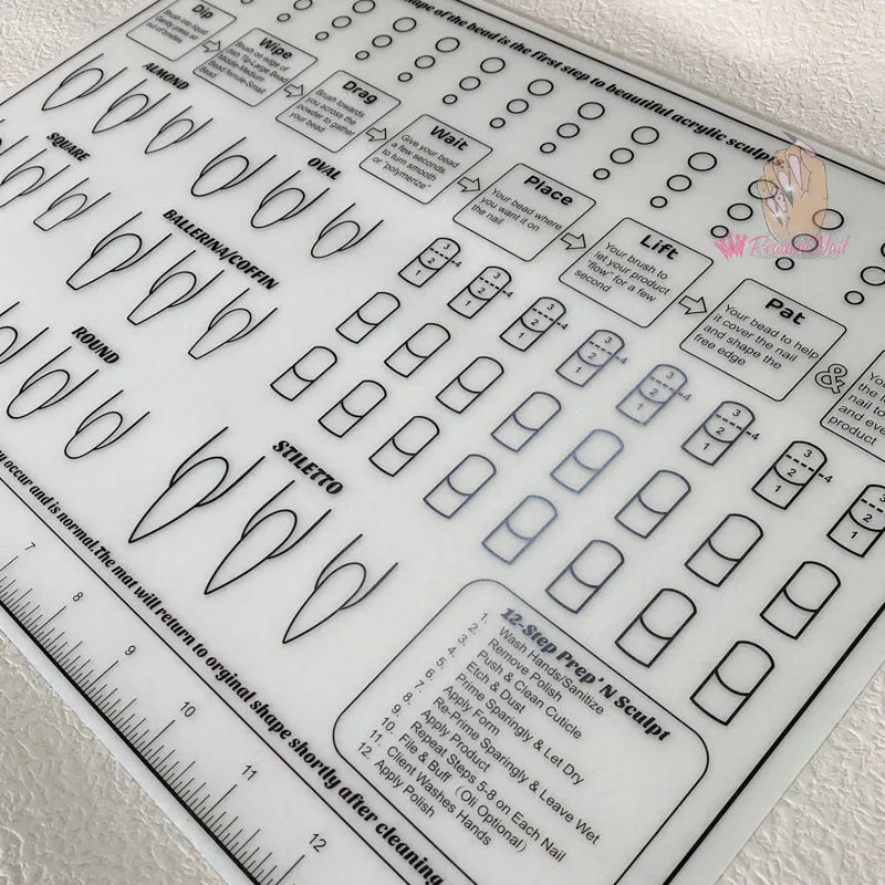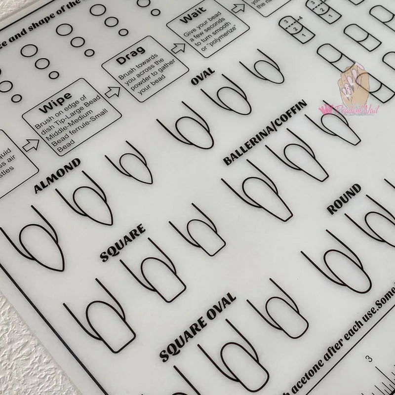 - Once you feel confident in your design skills it is time to practice. The practice area in the middle of the training mat features multiple nail shapes and sizes to continue improving your skills as an acrylic nail artist.